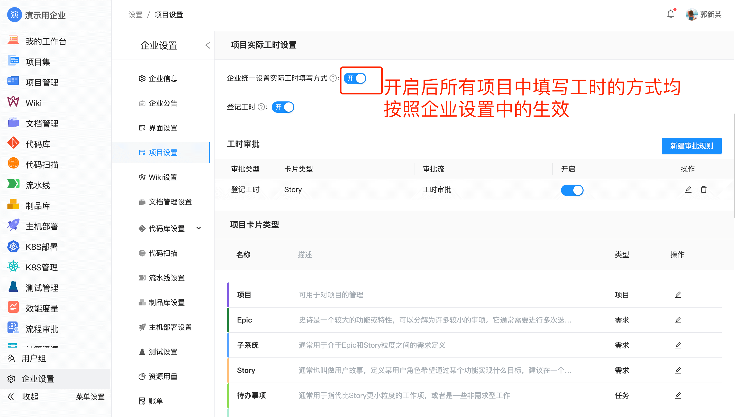 工时审批可以设置企业中统一设置实际工时填写方式,当开启时,全部项目均按照此企业中设置的方式填写实际工时,若不开启时均按照项目中设置的工时方式填写工时。