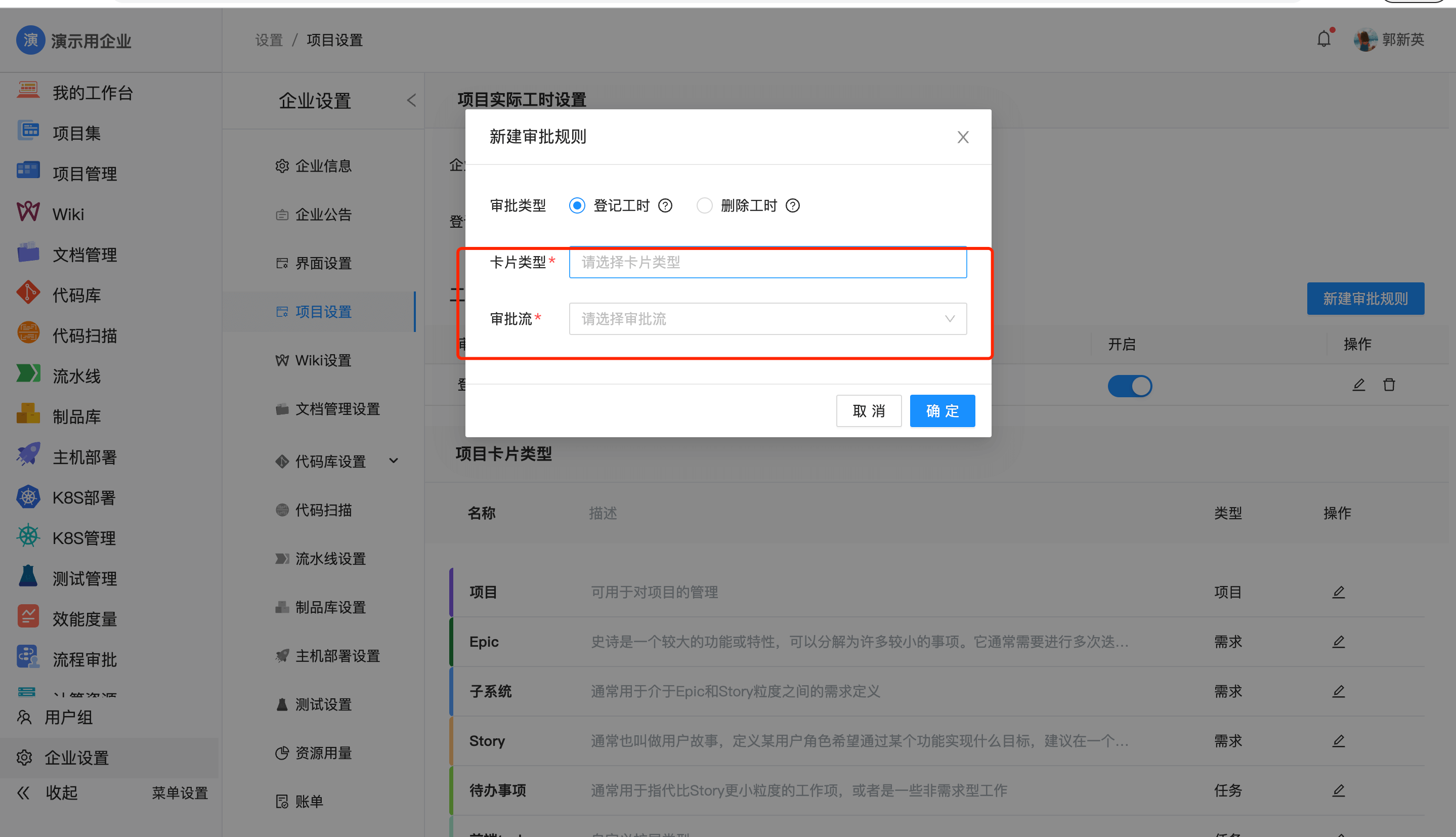 此处定义的是整个项目的卡片类型开关。项目管理默认支持11种卡片类型,包括通用的事务类型卡片用于非研发任务、非研发项目。
